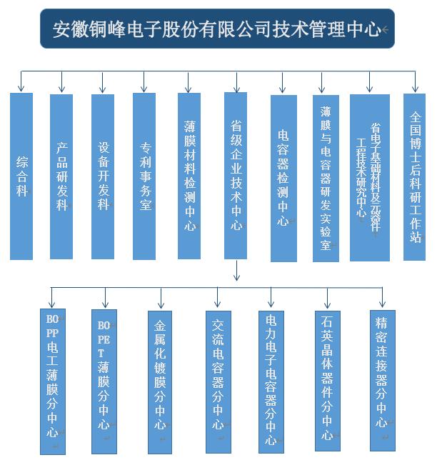 銅峰公司為國(guó)家高新技術(shù)企業(yè)、國(guó)家火炬計(jì)劃重點(diǎn)高新技術(shù)企業(yè)、國(guó)家火炬計(jì)劃銅陵電子材料產(chǎn)業(yè)基地重點(diǎn)骨干企業(yè)。公司建有完整的科研創(chuàng)新組織體系,設(shè)立技術(shù)管理中心作為技術(shù)研發(fā)的總管理機(jī)構(gòu),組織協(xié)調(diào)公司的各分子公司和相關(guān)部門,以確保公司技術(shù)創(chuàng)新精確高效地運(yùn)行。技術(shù)管理中心下設(shè)綜合科、產(chǎn)品研發(fā)科、設(shè)備開發(fā)科、專利事務(wù)室、薄膜材料檢測(cè)中心、電容器檢測(cè)中心以及薄膜與電容器研發(fā)實(shí)驗(yàn)室,同時(shí)下設(shè)省級(jí)企業(yè)技術(shù)中心、安徽省電子基礎(chǔ)材料及元器件工程技術(shù)研究中心以及國(guó)家級(jí)博士后科研工作站。